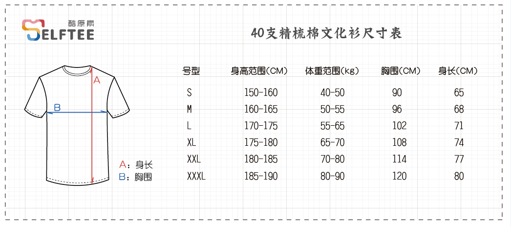 可以看到酷原素所有的尺寸表左边都有A,B的标识尺寸,这就是我们常说的胸围,身长两个最主要的标准
